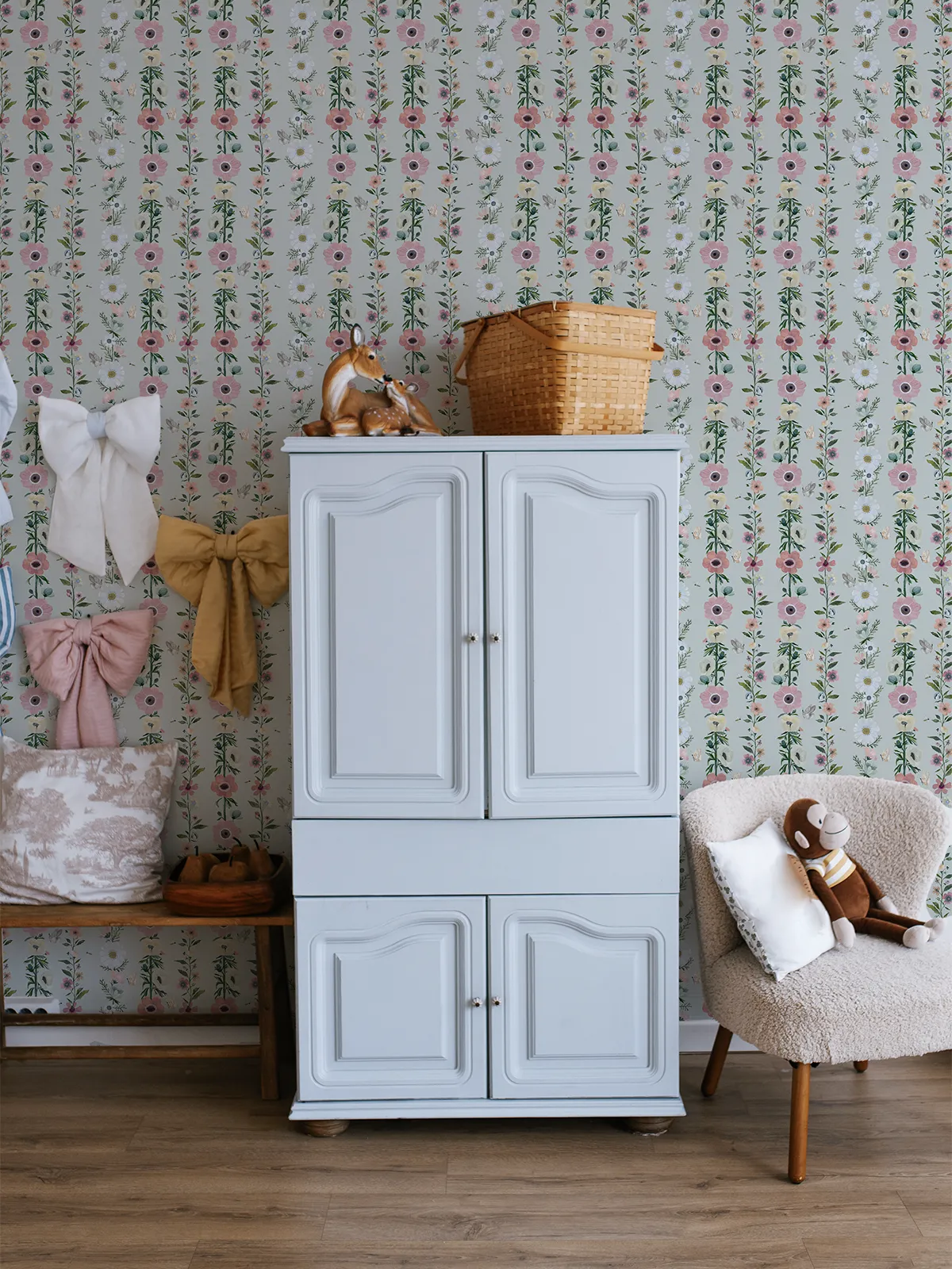 Os desenhos revelam composições delicadas, com repetições sutis e uma paleta suave, pensadas para criar movimento na parede sem pesar o ambiente.