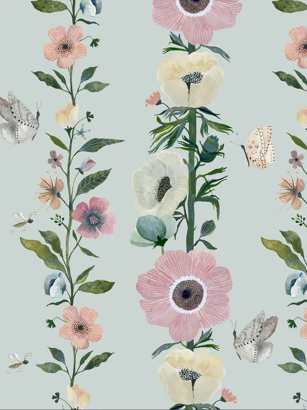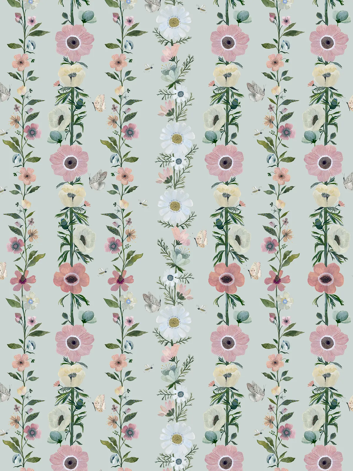 Com flores organizadas em colunas, esse modelo cria um ritmo marcante na parede, guiando o olhar de forma contínua e elegante. A composição reúne diferentes espécies em uma mesma linha, trazendo riqueza de detalhes sem perder a organização do desenho.