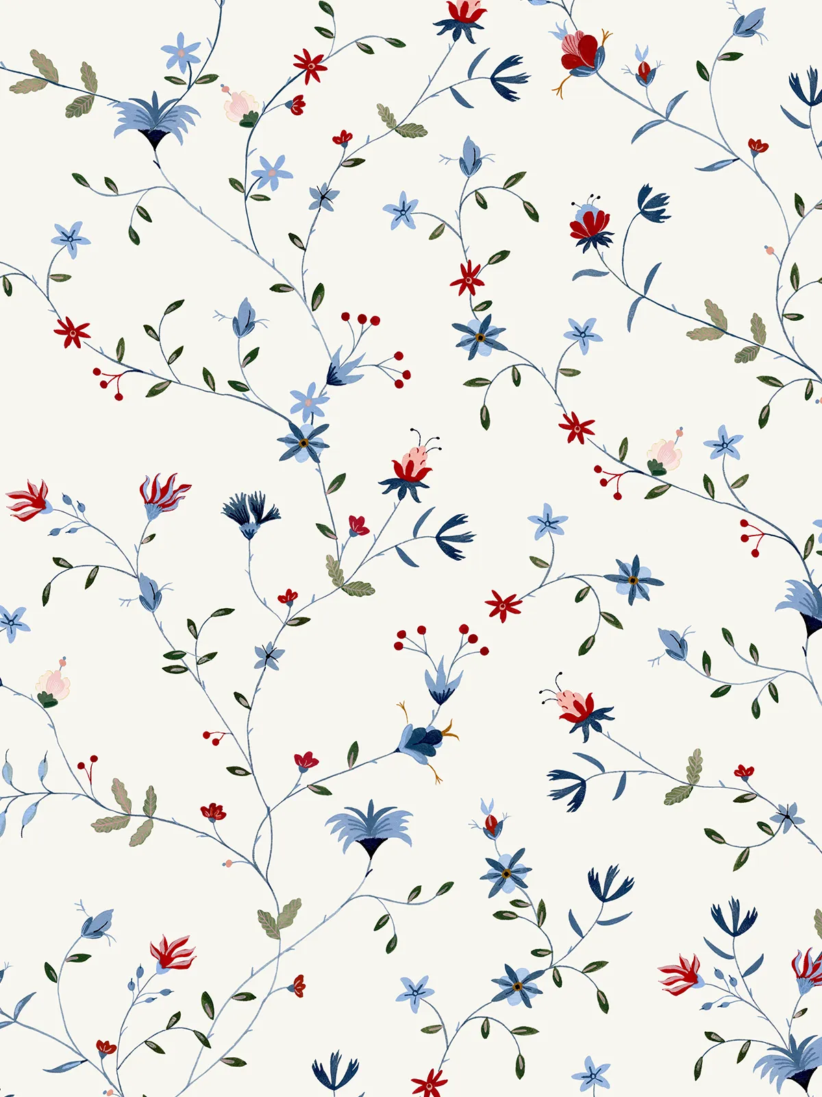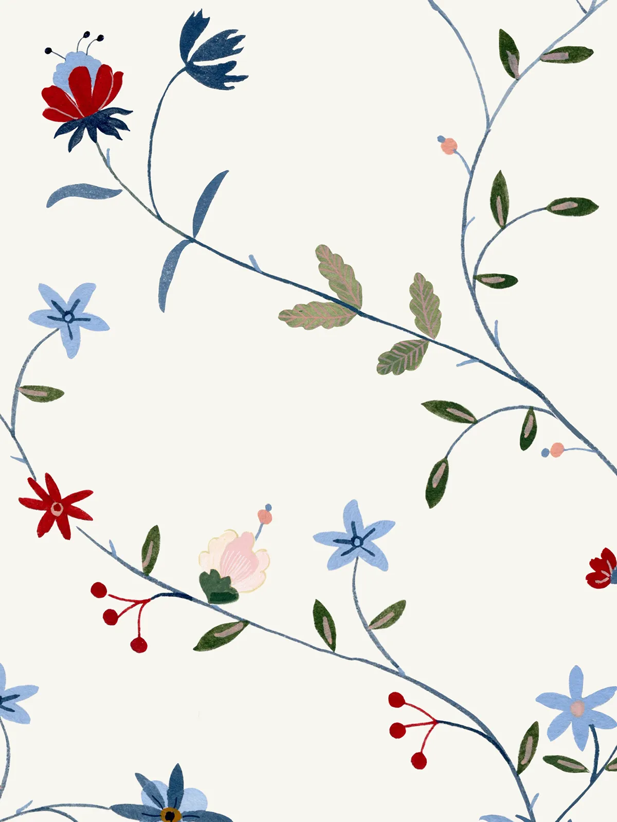 O Folk cria um desenho contínuo e orgânico, onde os ramos percorrem a parede de forma fluida, conectando flores e pequenos elementos ao longo do caminho. A composição tem um movimento natural, como se o desenho estivesse em crescimento.